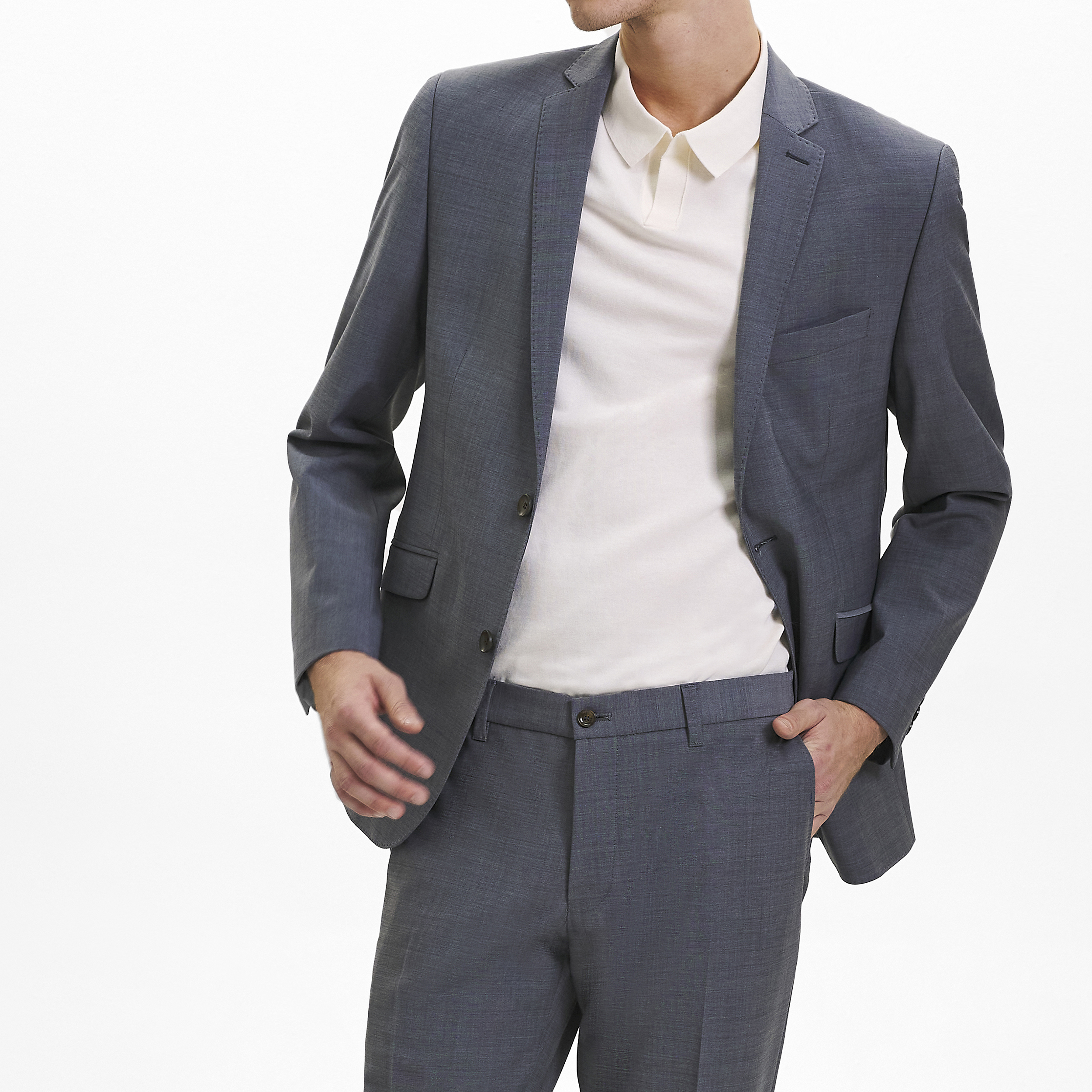 Colbert Weft Stretch voorzien van tweeknoopsluiting, twee zakken met klep en paspelzak aan de voorzijde, drie binnenzakken, dubbele split aan de achterzijde voor extra bewegingsvrijheid. 52% Polyester / 44% Wol / 4% Elastaan